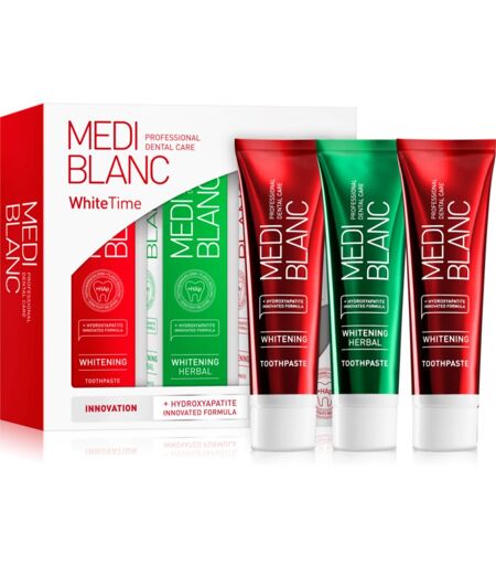 MEDIBLANC Dental Care White Time Set, 3x100 ml, Natural oral care unisex, The MEDIBLANC Dental Care White Time Set toothpaste is intended for gentle tooth whitening. It removes unwanted pigmentation from the teeth effectively and with regular use will reward you with a brighter smile. Characteristics: whitens teeth fights tooth decay and plaque guaranteed to be gentle on tooth enamel revitalises and looks after gums freshens breath How to use: It is advisable to use the toothpaste at least twice a day, in the morning and evening, or after every meal. ...