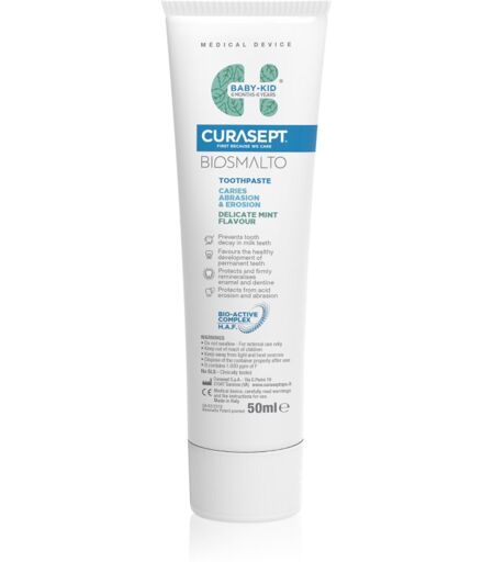 Curasept Biosmalto Baby-Kid, 50 ml, Oral care For Kids, The Curasept Biosmalto Baby-Kid toothpaste cleans children’s teeth perfectly and keeps them healthy and white. Characteristics: removes plaque prevents tooth decay protects the gums tastes pleasant ideal for brushing first teeth How to use: It is advisable to use the toothpaste at least twice a day, in the morning and evening, or after every meal. After use, rinse the mouth out thoroughly. Apply the toothpaste to the toothbrush and clean the teeth using gentle circular movements. ...