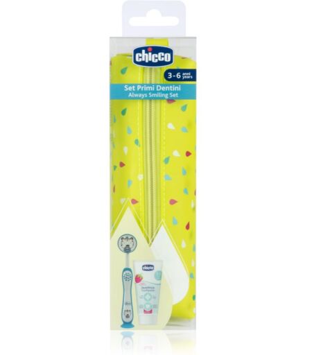 Chicco Always Smiling Set 3y+, 1 pc, Kids’ sets For Kids, The Chicco Always Smiling Set 3y+ toothbrush effortlessly encourages hygienic habits in children. The cheerful design makes cleaning teeth fun. Characteristics: cleans teeth gently and reliably comfortable to hold in the hand ideal for brushing first teeth a set at a favourable price practical zipper closure The set contains: Chicco Toothpaste 1-5 years Toothpaste for Children 50 ml Toothbrush 1 pc Case 1 pc How to use: Put toothpaste on the brush, moisten and clean the teeth and mouth. Rinse thoroughly. ...