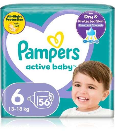 Pampers Active Baby Size 6, 56 pc, Disposable Nappies For Kids, A baby with a dry bum is a happy baby! Pampers Active Baby Size 6 disposable nappies will keep your child comfortable all day and all night and keep their bottom nice and dry, so that you can enjoy every moment together without any worries. Characteristics: for your baby’s maximum comfort and happiness several absorbing channels to drain moisture rapidly extra breathable material prevents leakage ...