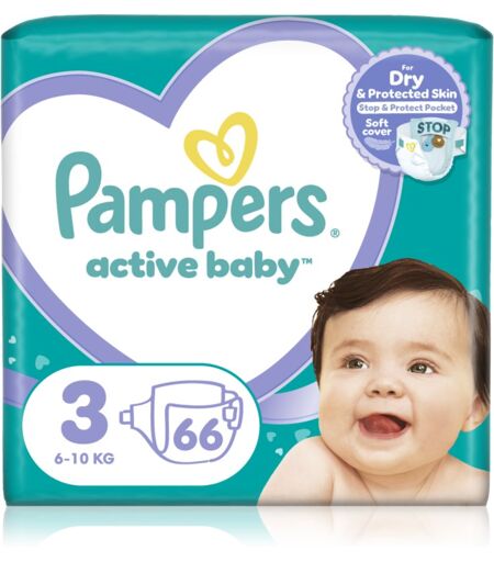Pampers Active Baby Size 3, 66 pc, Disposable Nappies For Kids, A baby with a dry bum is a happy baby! Pampers Active Baby Size 3 disposable nappies will keep your child comfortable all day and all night and keep their bottom nice and dry, so that you can enjoy every moment together without any worries. Characteristics: quick absorption for a dry feeling lets fresh air in and wetness out shape adapts to your baby’s body prevents leakage ...