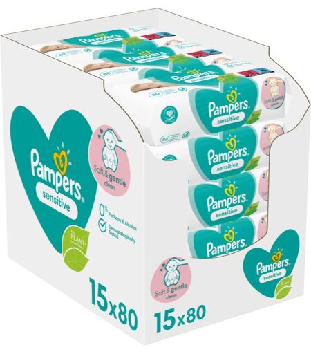 Pampers Sensitive, 15x80 pc, Baby Wipes For Kids, The Pampers Sensitive cleansing wipes take care of your child’s skin simply, quickly and reliably. Characteristics: looks after and cleanses children’s skin also suited to sensitive or allergy-prone skin soothes irritated areas removes dirt has a soft surface How to use: Clean your child’s skin gently with the wipe. Use as needed. ...