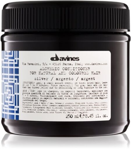 Davines Alchemic Conditioner Silver, 250 ml, Hair Conditioners for Women, During hair washing, shampoo opens the external hair structure - the cuticle. That's why it's important to give your hair a treatment after washing to reseal the cuticle. And that's exactly what the conditioner from DavinesAlchemicConditioner Silver takes care of. In addition to closing the hair fibre, it ensures its nourishment, hydration and softness, without which beautiful, shiny and healthy hair cannot do without. It will protect the hair from mechanical damage and dryness, as well as smooth the surface and help soften it, which will make it easier to detangle and further styling. Characteristics: provides the necessary hydration intensifies hair colour makes hair colour last longer How to use: Apply after first washing with shampoo. Leave to act for a while, then rinse thoroughly. ...