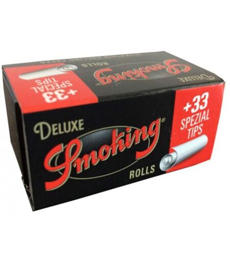Ideal for those who like to pack in different sizes depending on what they fancy. 4 metres of ultra-thin, highly transparent paper. Slow burning, watermarked with Smoking® and weighing 13 g/m2. 100 % natural Arabic gum with no dyes or other additives, with optimum stickiness per lick. The FSC® certificate guarantees environmental sustainability. The luxurious black edition from Smoking® also includes De Luxe paper filters, sold in one handy pack. Size: 44 mm x 4 mWeight: 13 g/m2Papers in booklet: 124 booklets per cartonCartons per box: 40Paper properties: slow burningPaper Type: Ultra ThinOrigin: FSC®Watermark: The Smoking® At the time of sale (in the shop / through a transport service / through another dispensing point) the seller will verify that the buyer is not under 18 years of age. ...