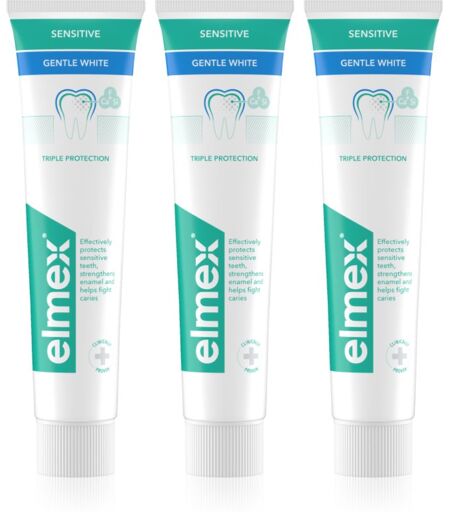 Elmex Sensitive Protection Gentle White, 3x75 ml, Toothpastes unisex, The Elmex Sensitive Protection Gentle White toothpaste for sensitive teeth guarantees you can have hot and cold drinks without an unpleasant sensation. Say goodbye to increased sensitivity in your teeth. Characteristics: reduces the sensitivity of teeth protects against tooth decay and plaque whitens teeth takes care of exposed teeth How to use: Use at least twice a day. Clean the teeth thoroughly for at least two minutes. ...