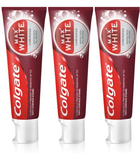 Colgate Max White Luminous, 3x75 ml, Toothpastes unisex, The Colgate Max White Luminous toothpaste is intended for gentle tooth whitening. It removes unwanted pigmentation from the teeth effectively and with regular use will reward you with a brighter smile. Characteristics: whitens teeth fights tooth decay and plaque freshens breath guaranteed to be gentle on tooth enamel How to use: Use at least twice a day. Clean the teeth thoroughly for at least two minutes. For further treatment of the teeth, use dental floss or an interdental brush. For more information about use, see the enclosed instructions. ...