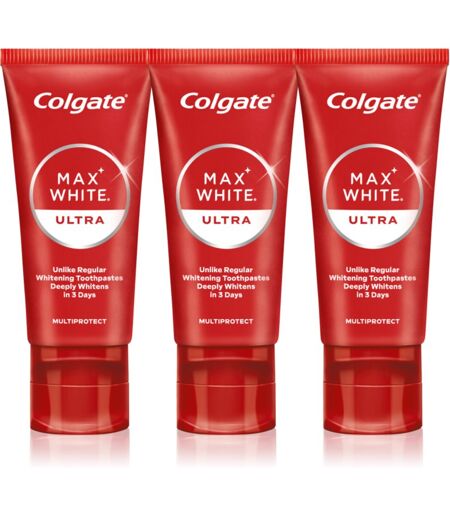 Colgate Max White Ultra Multiprotect, 3x50 ml, Whitenning toothpaste unisex, The Colgate Max White Ultra Multiprotect toothpaste is intended for gentle tooth whitening. It removes unwanted pigmentation from the teeth effectively and with regular use will reward you with a brighter smile. The set contains: Colgate Max White Ultra Multi Protect Whitening Toothpaste 50 ml Characteristics: whitens teeth guaranteed to be gentle on tooth enamel fights tooth decay and plaque removes plaque and tartar How to use: Use at least twice a day. ...