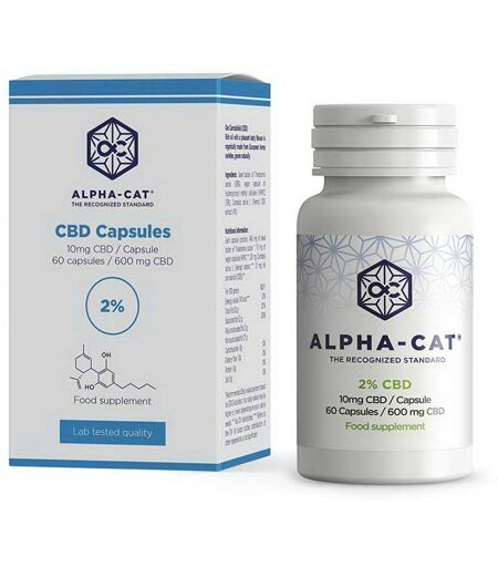 CBD (Cannabidiol) capsules are effective to improve immunity. This food supplement can help you to cope with stress and improve your well-being, both mental and physical, by helping you to overcome depression, anxiety, fear, loneliness, feeling of worthlessness, or guilt. CBD capsules deliver optimal relaxation and are consequently used to calm irritation of the nervous system. Alpha-cat capsules can be used as a food supplement to a healthy lifestyle, as they contain antioxidants and natural vitamins that contribute to physical and mental well-being. Long-term use contributes significantly to the normal functioning of the body and to a harmonious state of life. Alpha-cat products allow the achievement of a clear state of mind, restore interest in leisure time, daily activities and pleasure joy of living. They can help to keep you energized and improve your quality of life. CBD is a new natural food supplement obtain from organic hemp. Each capsule contains antioxidants and so helps you to combat stress and contribute to the proper body’s functioning and balance. Precautions for use: To be used within the context of a varied and balanced diet and a healthy lifestyle. Keep out of reach of children. For pregnant and lactating women ask your doctor for advice. This product is not a medical product. Store in a cool and dry place, away from light and humidity. Ingredients:Cocoa butter (75 %), hydroxypropylmethyl cellulose (HPMC) vegetable capsules (13 %), hemp extract (12 %) Weight: 32.4 grams ± 5 % Nutritional information:each capsule contains: 365 mg cocoa butter **, 75 mg HPMC herbal capsules ** (not included in the calculation of% CBD content), 60 mg hemp extract **, approx. 10 mg cannabidiol (CBD) ** per 100 g% DDD *Energy value 707 kcal *** 35 %Fat 79 g 121 %saturated fatty acids 50 g 249 %polyunsaturated fatty acids 2 gMonounsaturated fatty acids 26 gCarbohydrates 0 g 0 %Fiber 0 g 0 %Protein 0 g 0 %Salt 0 g 0 % * The recommended daily intake (DDD) percentages are based on a 2000 kcal intake reference value. Your daily needs may vary depending on your energy needs. ** DDD not specified. *** Corresponds to the nutritional value of cocoa butter, the contribution of other ingredients is negligible. 2% CBD capsules / 600 mg CBD / 60 pieces Recommended dosage:1-15 capsules per day (10-150 mg CBD). Do not exceed the recommended dosage. ALPHA-CAT CBD capsules are made from 100% natural hemp grown in Europe. Our vegan-friendly herbal capsules contain organic cocoa butter. Origin of suppliers of primary raw materials: cocoa butter (United Kingdom), HPMC herbal capsules (France), hemp extract (Czech Republic). CANEBE products are 100% organic, made from organic hemp and certified vegan ingredients of natural origin. Dietary supplement Products have undergone extensive laboratory analysis to ensure the absence of synthetic cannabinoids. We prioritize quality and safety in products to provide you with the best experience possible. Please note: Not for... ...
