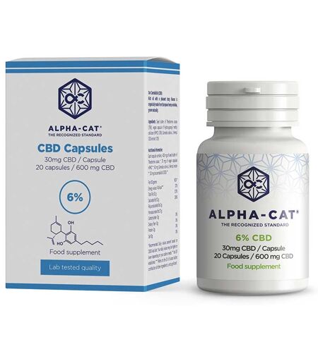 CBD (Cannabidiol) capsules are effective to improve immunity. This food supplement can help you to cope with stress and improve your well-being, both mental and physical, by helping you to overcome depression, anxiety, fear, loneliness, feeling of worthlessness, or guilt. CBD capsules deliver optimal relaxation and are consequently used to calm irritation of the nervous system. Alpha-cat capsules can be used as a food supplement to a healthy lifestyle, as they contain antioxidants and natural vitamins that contribute to physical and mental well-being. Long-term use contributes significantly to the normal functioning of the body and to a harmonious state of life. Alpha-cat products allow the achievement of a clear state of mind, restore interest in leisure time, daily activities and pleasure joy of living. They can help to keep you energized and improve your quality of life. CBD is a new natural food supplement obtain from organic hemp. Each capsule contains antioxidants and so helps you to combat stress and contribute to the proper body’s functioning and balance. Precautions for use: To be used within the context of a varied and balanced diet and a healthy lifestyle. Keep out of reach of children. For pregnant and lactating women ask your doctor for advice. This product is not a medical product. Store in a cool and dry place, away from light and humidity. Ingredients:Cocoa butter (75 %), hydroxypropylmethyl cellulose (HPMC) vegetable capsules (13 %), hemp extract (12 %) Weight: 32.4 grams ± 5 % Nutritional information:each capsule contains: 365 mg cocoa butter **, 75 mg HPMC herbal capsules ** (not included in the calculation of% CBD content), 60 mg hemp extract **, approx. 30 mg cannabidiol (CBD) ** per 100 g % DDD *Energy value 707 kcal *** 35 %Fat 79 g 121 %saturated fatty acids 50 g 249 %polyunsaturated fatty acids 2 gMonounsaturated fatty acids 26 gCarbohydrates 0 g 0 %Fiber 0 g 0 %Protein 0 g 0 %Salt 0 g 0 % * The recommended daily intake (DDD) percentages are based on a 2000 kcal intake reference value. Your daily needs may vary depending on your energy needs. ** DDD not specified. *** Corresponds to the nutritional value of cocoa butter, the contribution of other ingredients is negligible. 6% CBD capsules / 600 mg CBD / 20 pieces Recommended dosage:1-5 capsules per day (30-150 mg CBD). Do not exceed the recommended dosage. ALPHA-CAT CBD capsules are made from 100% natural hemp grown in Europe. Our vegan-friendly herbal capsules contain organic cocoa butter. Origin of suppliers of primary raw materials: cocoa butter (United Kingdom), HPMC herbal capsules (France), hemp extract (Czech Republic). CANEBE products are 100% organic, made from organic hemp and certified vegan ingredients of natural origin. Dietary supplement Products have undergone extensive laboratory analysis to ensure the absence of synthetic cannabinoids. We prioritize quality and safety in products to provide you with the best experience possible. Please note: Not for... ...
