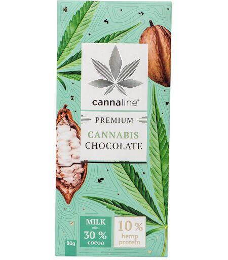 Heavenly milk chocolate with 10% of hemp protein.   How to best enjoy cannabis chocolate: On its own as a snack or paired with a hot beverage.   Nutritional information: per 100 g Energy value 2252 kJ/539 kcal Fats 33,6 g  from which saturated fatty acids 22,2 g Carbohydrates 51,2 g  from which sugars 48,4 g Protein 8,2 g Salt 0 g Fibre 2,2 g   Manufacturer: Cannaline Netto weight: 80 g Shelf life: 18 months Storage: Store in a cool dry place. Notice: May contain traces of milk, sesame, hazelnuts and peanuts. THC-free. GMO-free. Ingredients: Sugar, cocoa butter, cocoa mass, milk powder, hemp protein (10 %), emulsifier rapeseed lecithin, vanilla flavour. Milk solids min 14 %. Cocoa solids min 30 %.   ...