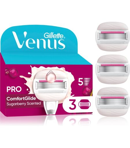 Gillette Venus ComfortGlide Sugarberry, 3 pc, Replacement blades for Women, Not getting the same precision results with your shaver as before? It’s time to change the blade. The GilletteVenusComfortGlide Sugarberry spare blades and their regular replacement guarantee you the same smooth shave as with a new shaver. Characteristics: shaving gel is not needed – just wet it integrated moisture strips release caring substances adjusts flexibly to every curve blades ensure a smooth shave easily interchangeable shaving heads How to use: Use for shaving in combination with the corresponding shaver handle. For best results, use with shaving foam, cream or oil. ...