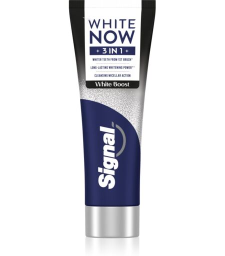 Signal White Now 3-in-1 White Boost, 75 ml, Whitenning toothpaste for Women, The Signal White Now 3-in-1 White Boost toothpaste is intended for gentle tooth whitening. It removes unwanted pigmentation from the teeth effectively and with regular use will reward you with a brighter smile. Characteristics: whitens teeth fights tooth decay and plaque guaranteed to be gentle on tooth enamel revitalises and looks after gums also suitable for people with sensitive teeth and gums How to use: Use at least twice a day. Clean the teeth thoroughly for at least two minutes. For further treatment of the teeth, use dental floss or an interdental brush. ...