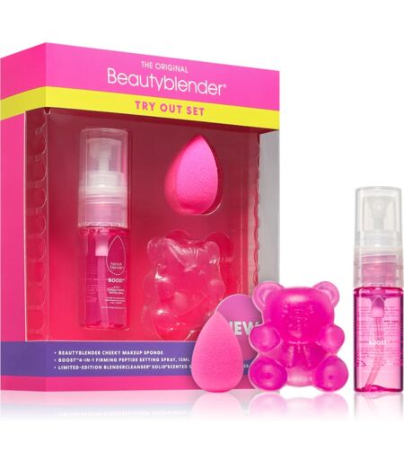 beautyblender® Try Out Set, 3 pc, Setting spray for Women, The set contains: BeautyBlender Sponge & Brush Cleanser Brush Cleanser 1 pc BeautyBlender Sponge Makeup Sponge 1 pc BeautyBlender Boost™ 4-in-1 Firming Peptide 18-Hour Setting Spray Makeup Fixing Spray 13 ml Characteristics: the result is a smooth finish smooth foam applicator gives a professional appearance to your makeup removes makeup residue from brushes ensures easy application on your face, even in corners suitable for powders How to use: Dampen the sponge before use. Always start from the centre of your face and move outwards. After use, wash the sponge in lukewarm soapy water. ...