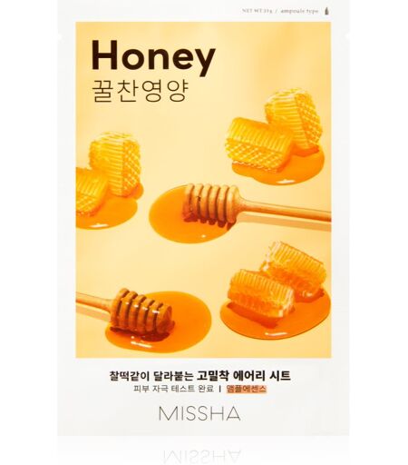 Missha Airy Fit Honey, 19 g, Sheet masks for Women, Does it feel as though your skin isn’t quite right and needs something more than just the care provided by a cream? This face mask from MisshaAiry FitHoney is the perfect product to enrich your skincare routine – it pampers the skin and delivers an intensive treatment, bringing about an instant improvement in the skin’s appearance. Characteristics: leaves skin silky soft to the touch brightens and freshens does not irritate the skin How to use: Carefully remove the mask from the packaging and apply to a cleansed face. Leave to act for the time indicated on the packaging. ...