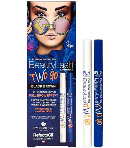 FULL BROW Tinting Pen TWO GO - Tinting pens for eyebrows. No more mixing is necessary, the color is applied in 2 simple steps with the pens one after the other. The result lasts for several weeks and is smudge-proof and waterproof. Dermatologically and ophthalmologically testedAlso suitable for allergy sufferersContents for at least 10 applications How to use 1. prepare + clean - remove contact lenses. Clean the eyebrows with RefectoCil Eye Make-up Remover. For optimum results, the hairs must be dry and free of grease. 2. apply gel 1 - Open the white pencil and twist until the tip of the brush is covered with gel. Now apply the gel directly to the eyebrows. All hairs should be completely wetted. Leave on for 2 minutes, the gel 1 is absorbed by the hair. 3. remove gel 1 - After the application time of 2 minutes, remove the remaining gel 1 with a dry cotton bud or cosmetic tissue. 4. apply gel 2 - Open the blue pen and turn it until the tip of the brush is covered with gel. Apply Gel 2 precisely with the tip of the brush. The hair should be completely covered with gel from root to tip. Leave on for one minute. Optional: To precisely protect the skin from unwanted staining, we recommend using the Brow Mapper or the RefectoCil skin protection cream. Simply outline the eyebrows. Caution: The hairs should not come into contact with it, otherwise the color will not work! Tip: If the skin still gets color unintentionally, we recommend RefectoCil Color Stain Remover. 5 After one minute, remove the gel 2 with a damp cotton pad. DONE! The color lasts for several weeks. ...