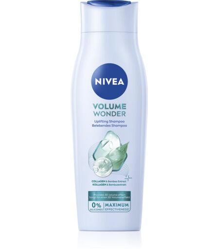 NIVEA Volume Wonder, 250 ml, Shampoos for Women, In order to keep your hair healthy, shiny and vibrant, it's important to give it the proper care. And that starts with regular hair washing. A shampoo from NIVEAVolumeWonder will help to effectively remove any dirt, grease and styling and cosmetic product residues from the hair and scalp. It gives you a feeling of freshness and cleanliness, and ideally prepares your hair and scalp for further care while supporting the effects of the active ingredients it contains. Characteristics: washes hair and cleans the scalp adds shine and volume leaves hair soft strengthens the hair fibre Ingredients: no silicones How to use: Apply an appropriate amount of shampoo to wet hair. Work up a lather and rinse thoroughly. For best results, follow up with other products from the same range. ...