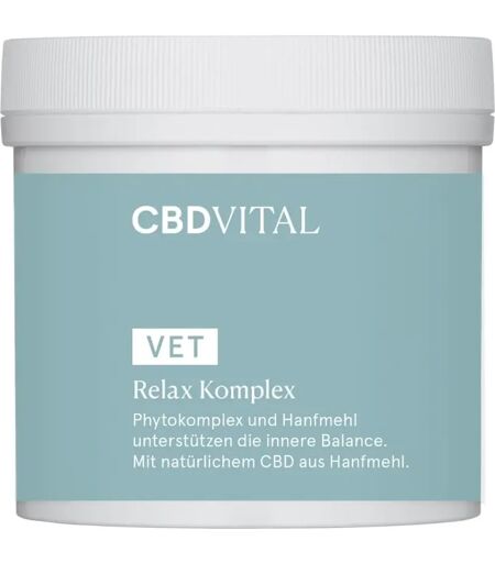 Supports the inner balance of our four-legged friends - For dogs and cats- Herbal support for restlessness in everyday life.- With a natural source of CBD from hemp.- Because our four-legged friends deserve only the best. Our dear four-legged friends respond to certain things and circumstances. A lot of what we perceive as perfectly normal can ensure that animals get caught up in unpleasant stress, restlessness and hectic rushes. The triggers for restless stress can be many. Loud or unfamiliar noises, sirens, New Year's Eve fireworks, car trips or crowds, etc. All of these can bother our four-legged friends and manifest themselves in different ways. Some pets are hyperactive, others are prone to restlessness and tension, and still others are overly enthusiastic. CBD VITAL VET Relax Complex A special formulation of valerian, lemon balm, hops, brewer's yeast and St. John's wort provides inner balance and equilibrium. Particularly effective is the special formula from hemp flour, which is rich in natural cannabidiol. The synergistic formula helps your pet calm down more easily and promotes balance and equanimity in everyday life. Benefits - With a natural source of CBD from hemp- With soothing valerian, lemon balm, hop blossoms and St. John's Wort- With vitamin B complex from brewer's yeast- For stress and hectic everyday life or in certain situations- Anti-stress formula for four-legged friends- Provides peace and serenity- Herbal support for restlessness, hyperactivity and overwork in everyday life- Ideally dosed - optimally tolerated- Free from flavours, attractants, colours and preservatives How to administrate Simply put with food. The daily dose can be adjusted before particularly stressful situations. Feeding instructions (1 scoop equals 1 g) - Small dogs and cats (4 to 15 kg) 1 - 2 g per day- Medium dogs (16 to 39 kg) 2 to 4 g per day- Large dogs (40 to 80 kg) 4 - 8 g per day Ingredients: valerian root, lemon balm leaves, St. John's wort, hop flowers, brewer's yeast, hemp flour 3 %, sunflower oil Analytical ingredients: crude protein 13,1 %, crude fat 7 %, crude fibre 15,6 %, crude ash 10,7 %, sodium 0,1 % Products have undergone extensive laboratory analysis to ensure the absence of synthetic cannabinoids. We prioritize quality and safety in products to provide you with the best experience possible. Not intended for direct consumption or smoking. Intended for use for animals.This product is a supplement and is not intended to diagnose, treat, cure or prevent any disease. Upon sale (at the store / via a transport service / via another dispensing point), the seller will verify that the buyer is not under 18 years of age. ...
