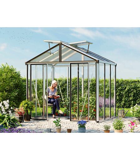 263 x 199 cm Greenhouse, anthracite grey, RAL 7016: The stable HERA Greenhouse from GFP offers outstanding durability and functionality. It comes with a foundation frame and a double sliding door for easy access. The four walls are made from 4 mm toughened safety glass, while the front and rear gables and roof areas feature 16 mm thick twin-wall polycarbonate sheets for excellent insulation. Crafted with a high-quality aluminium frame - ‘Designed in Austria’ - and durable polycarbonate panels - ‘Made in Germany’ - this greenhouse is built to last. The extra-high 193 cm side walls provide ample space for your plants. Available in sizes from 263x138 cm to 263x575 cm, you can choose between a natural aluminium finish or, for an additional cost, a sleek powder-coated anthracite option. With a 15-year guarantee on the aluminium frame and a 10-year guarantee on the polycarbonate panels, this greenhouse offers both reliability and peace of mind. ...