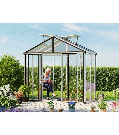 263 x 138 cm Greenhouse, anthracite grey, RAL 7016: The stable HERA Greenhouse from GFP offers outstanding durability and functionality. It comes with a foundation frame and a double sliding door for easy access. The four walls are made from 4 mm toughened safety glass, while the front and rear gables and roof areas feature 16 mm thick twin-wall polycarbonate sheets for excellent insulation. Crafted with a high-quality aluminium frame - ‘Designed in Austria’ - and durable polycarbonate panels - ‘Made in Germany’ - this greenhouse is built to last. The extra-high 193 cm side walls provide ample space for your plants. Available in sizes from 263x138 cm to 263x575 cm, you can choose between a natural aluminium finish or, for an additional cost, a sleek powder-coated anthracite option. With a 15-year guarantee on the aluminium frame and a 10-year guarantee on the polycarbonate panels, this greenhouse offers both reliability and peace of mind. ...