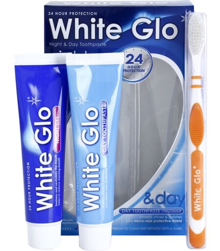 White Glo Night & Day Toothpaste Set, , Whitenning toothpaste unisex, The White Glo Night & Day Toothpaste Set whitening kit will help you achieve a radiant smile quickly and easily. The set contains: Toothpaste day 100 g Toothpaste night 100 g Toothbrush 1 pc Characteristics: removes plaque polishes the surface of your teeth helps stop tooth decay whitens teeth removes stains freshens breath How to use: Put toothpaste on the brush, moisten and clean the teeth and mouth. Rinse thoroughly. ...