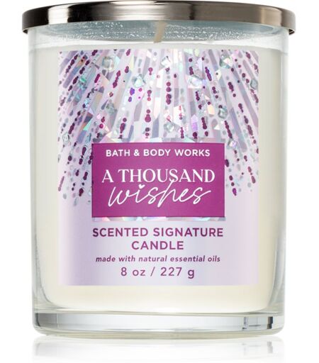 Bath & Body Works A Thousand Wishes, 227 g, Scented Candles Home Scents, The Bath & Body Works A Thousand Wishes scented candle will give your home a wonderful fragrance and create a cosy atmosphere that will make you feel great all the time. Ingredients: with essential oils with soy wax How to use: Place the candle on a heat-resistant surface. Do not leave to burn for more than four hours. Never let the candle burn to the end. Never leave a burning candle unattended or close to easily flammable objects. Keep out of the reach of children and pets. Always let the candle burn until the surface completely melts to prevent an unwanted hollow in the wax from forming. For optimal burning, we recommend regularly trimming the wick down to the recommended length. ...