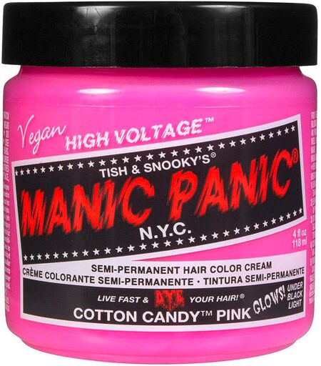 The High Voltage Classic semi-permanent hair dye from Manic Panic includes a variety of vibrant shades. The high-quality ingredients used ensure that you get a high-quality color result. The nourishing ingredients in the formula condition the hair during coloring and ensure a silky, shiny finish and a smooth hair feel. Cotton Candy Pink is a beautiful, bright, cool neon pink. This shade glows under black light. We therefore recommend using Cotton Candy Pink on hair that has been previously lightened to blonde level 9 or lighter. Important features: Required hair level: 9 or higherIntensity: LightColor longevity: ModerateUV reactive: Yes Manic Panic hair colors are ready to use and no developer is required. Vegan and cruelty-freeFree from: PPD, parabens, ammonia, resorcinol, phthalates and glutenApproximately 4 - 6 weeks of long-lasting colorFades gradually with every hair washShades can be mixed with each otherCan be combined with the Pastel-izer to create soft, trendy pastel shades8 UV-reactive shades available that glow under black lightReady to use, no developer requiredBest results with pre-lightened hairMade in the USA How many 118 ml cans do I need for my hair? Short to bob-length hair: 1 - 2 doses, depending on hair thickness. Shoulder to waist length hair: 2 - 3 doses, depending on hair thickness. For thick hair, an additional can may be required for the ends. Waist-length and longer hair: 3+ doses, depending on the thickness of the hair. Application: 1. wash hair with a deep cleansing shampoo, do not use conditioner.2. dry hair with a blow dryer to ensure hair is extremely porous3. put on gloves and apply the tint strand by strand with a coloring brush. Make sure that each strand of hair is covered with enough color to avoid a patchy result.4. then comb through the hair to ensure that the color is evenly distributed. The color cream may become slightly foamy.5. cover the hair with a plastic cap and leave the color in for 30-45 minutes. For more intensity, leave under a heat source.6. rinse the hair with cold water until the water runs clear. Avoid contact with face and body. Do not shampoo hair.7. style as desired. To avoid color transfer, always make sure hair is completely dry. Warnings: For external use only. Keep out of reach of children. Use only as directed. This product contains ingredients that may cause skin irritation in certain individuals; therefore, a preliminary test should first be carried out according to the enclosed instructions. Do not use this product to tint eyebrows or eyelashes; this may cause blindness. If the product gets into the eyes, rinse the eyes immediately with water and seek medical advice. ...