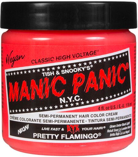 The High Voltage Classic semi-permanent hair dye from Manic Panic includes a variety of vibrant shades. The high-quality ingredients used ensure that you get a high-quality color result. The nourishing ingredients in the formula condition the hair during coloring and ensure a silky, shiny finish and a smooth hair feel. Pretty Flamingo is a warm pink with orange undertones. Pretty Flamingo glows under black light, so we recommend lightening hair to blonde level 10 or lighter before application. Important features: Required hair level: 10 or higherIntensity: BrightLongevity of the color: LowUV reactive: Yes Manic Panic hair colors are ready to use and no developer is required. Vegan and cruelty freeFree from: PPD, parabens, ammonia, resorcinol, phthalates and glutenApproximately 4 - 6 weeks of long-lasting colorFades gradually with every hair washShades can be mixed with each otherCan be combined with the Pastel-izer to create soft, trendy pastel shades8 UV-reactive shades available that glow under black lightReady to use, no developer requiredBest results with pre-lightened hairMade in the USA How many 118 ml cans do I need for my hair? Short to bob-length hair: 1 - 2 doses, depending on hair thickness. Shoulder to waist length hair: 2 - 3 doses, depending on hair thickness. For thick hair, an additional can may be required for the ends. Waist-length and longer hair: 3+ doses, depending on the thickness of the hair. Application: 1. wash hair with a deep cleansing shampoo, do not use conditioner.2. dry hair with a blow dryer to ensure hair is extremely porous3. put on gloves and apply the tint strand by strand with a coloring brush. Make sure that each strand of hair is covered with enough color to avoid a patchy result.4. then comb through the hair to ensure that the color is evenly distributed. The color cream may become slightly foamy.5. cover the hair with a plastic cap and leave the color on for 30-45 minutes. For more intensity, leave under a heat source.6. rinse the hair with cold water until the water runs clear. Avoid contact with face and body. Do not shampoo hair.7. style as desired. To avoid color transfer, always make sure hair is completely dry. Warnings: For external use only. Keep out of reach of children. Use only as directed. This product contains ingredients that may cause skin irritation in certain individuals; therefore, a preliminary test should first be carried out according to the enclosed instructions. Do not use this product to tint eyebrows or eyelashes; this may cause blindness. If the product gets into the eyes, rinse the eyes immediately with water and seek medical advice. ...