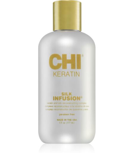 CHI Keratin Silk Infusion, 177 ml, Hair Serums for Women, An immediate dose of intense hydration and nutrition will be delivered byCHI Keratin Silk Infusion non-rinse hair care. It will provide your hair with all it needs right after washing without you having to spend more time than necessary in the bathroom. It will help smooth and restore your hair's natural shine and the integrity of its structure. It promotes their regeneration and contributes to easier detangling. All this quickly, easily and without the need for rinsing. Just apply, wash, or comb through, and the beauty and health of your hair is taken care of. Try this leave-in conditioner and discover a quick and easy way to regenerate your hair with many additional benefits. Characteristics: provides hydration and nourishment for your hair leaves hair beautifully shiny and full of vitality prevents split ends tames unruly hair How to use: Apply to towel-dried hair. Do not rinse. Style your hair as usual. ...