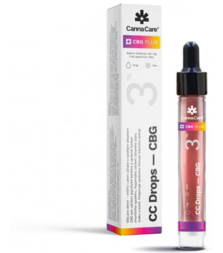 Oil for daily - internal, both external use with a high content of CBG to maintain mental condition and proper immune system function. Helps maintain normal vision and bones. It supports the proper functioning of the digestive system. Packaging - 7 ml CC Drops CBG contains 0 % THC. Each pack contains 210 mg CBG. Each drop contains 1 mg of Full-spectrum CBG extract. Cannabinoids: CBG, CBD, CBDV, CBC, CBN Terpenes: α-Pinene, Limonene, Eucalyptol, α-Terpinolene, α-Humulene The intense activity should be replaced by equally intense rest. Relax CC capsules will help you relax to quality sleep and relieve muscle pain and cramps. CC Drops CBG drops are especially suitable for - the proper functioning of the immune system- maintaining normal mental activity during mental strain and stress- healthy eyesight- long-term support of the proper functioning of the nervous and cardiovascular system- reduction of fatigue and exhaustion- maintaining healthy bones- protection of cells from oxidative stress- promoting the proper functioning of the digestive system- healthy skin condition- normal blood clotting- maintaining the overall good condition of the organism CannaCare products will not intoxicate you! We only take what we need from cannabis. The cannabinoids CBD and CBG have no narcotic effects. Therefore, you will not experience any unwanted changes in your state of consciousness while using our products. The product does not contain THC. An unprecedented combination of sea buckthorn oil and CBG cannabinoid Sea buckthorn oil has many beneficial effects on the human body. The use of sea buckthorn has a very long history - it has been used in Tibet, Mongolia, and India, where it had an irreplaceable place and ancient Greece and Rome. Thanks to its beneficial synergy with cannabinoids, we decided to use it as one of the products' two main ingredients. Thanks to sea buckthorn oil, CannaCare drops are rich in unsaturated fatty acids, tannins, vitamins, and flavonoids. Vitamin A, Beta-Carotene Vitamin A is involved in the immune system's normal function and maintaining the normal state of eyesight, skin, and mucous membranes. Vitamin C Vitamin C helps maintain the normal function of the immune system during and after intense physical activity. Furthermore, collagen is formed for the normal function of blood vessels, cartilage, gums, teeth, bones, and skin. It is involved in the activities of the nervous system and energy metabolism. It helps protect cells from oxidative stress, iron absorption and reduces fatigue and exhaustion. Vitamin E Vitamin E helps protect cells from oxidative stress. Vitamin K Vitamin K contributes to blood clotting and maintaining the normal condition of bones. Tannins Tannins are antioxidants and aid normal digestive function. Vitamin B6 Vitamin B6 is involved in the activity of the nervous system and energy metabolism. It contributes to the production of red blood cells and the normal function of the immune system. It helps to reduce... ...