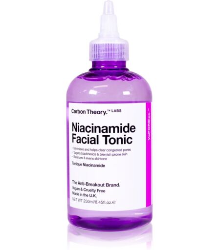 Carbon Theory Vaporeize Niacinamide Facial Tonic, 250 ml, Skin Toners for Women, Something that’s just as important as the cleansing process itself is the transition between cleansing and the skincare routine that follows. The individual steps in these processes are connected in the ideal way and your entire routine is enriched by using a facial toner Carbon Theory Vaporeize Niacinamide Facial Tonic. It takes care of complete skin cleansing, removing makeup residue, impurities and cleansers while gently toning the skin. It leaves it not only perfectly clean and ready for any treatment that follows, but also refreshed, soothed and balanced. Characteristics: it rids the skin of dirt and grease it hydrates and nourishes the skin tightens pores reduces signs of acne leaves the skin soft, fresh and radiant Ingredients: vegan product niacinamide – promotes skin brightening, reduction of pigment spots, colour evenness and smoothing of rough texture, helps to strengthen the protective skin barrier and thus improve the level of skin hydration citric acid – removes dead skin cells by exfoliation, helps to restore the top layer of skin, contributes to a balanced tone, brightens and smooths How to use: Put on a cotton wool pad and apply to skin using circular movements. Do not rinse. Use every morning and/or evening. Only apply to intact skin. ...