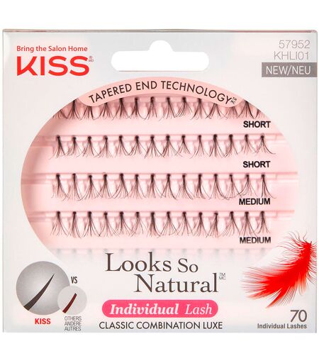 Create your own individual and elegant look with the KISS Looks So Natural eyelash clusters. Each cluster contains individual lashes of different lengths to create a natural, feathery but voluminous look. Gorgeous lashes in the blink of an eye! Innovative technology for a natural look. Reusable up to 10 times. The set contains 70 individual lashes in short and medium lengths with KISS lash glue (0.7 g) Application: Use tweezers to carefully remove the lashes from their packaging. Dip the knotted end of the trio lashes into the glue. Apply the lashes along the lash line. Start at the outer end. Hold them in place while the glue dries. Slowly work your way to the other end of the lashes in this way. ...