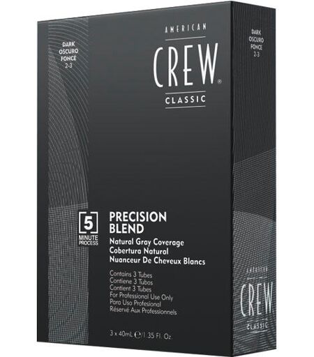 American Crew offers a compelling, time-saving method of natural gray hair coverage. With the Presicion Blend service for gray hair, clients feel 5 years younger in just 5 minutes. Presicion Blend is not a traditional color service. Gray hair is visually matched to natural hair color and contrasts are reduced. Depending on the color shade, the amount of color and the color technique, the white coverage varies from 25%, 50% up to 75% in the result. Presicion Blend is the ultimate color service for men. This is what makes Presicion Blend special: only 5 minutes application timeammonia-freenatural resultsuitable for scalp hair and beardfour cool shadesprovides extra moisture through provitamin B5 Application: In a color bowl, mix American Crew® Precision Blend and developer (4.5%) in a 1:1 ratio. For a client with 2.5 cm long hair, a mixture of 20 ml is usually sufficient. American Crew® color develops in the hair in just five minutes. Set the clock as soon as the color is applied. Shampoo the hair again after the five minutes to rinse out the excess color. Terry the hair with the towel, and finish your service with the desired styling. Contents: 3 x 40 ml ...