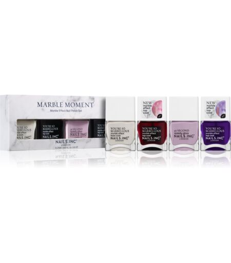Nails Inc. Marble Moment, , Nail Varnishes for Women, The Nails Inc. Marble Moment nail polish will give you beautifully styled nails in moments. The set contains: Totally Marbellous Nail Polish 14 ml May The Quartz Be With You Top Coat 14 ml Better Times In Battersea Nail Polish 14 ml Taken For Granite Top Coat 14 ml Characteristics: bright, rich colour ensures a high gloss easy to apply long-lasting Ingredients: vegan product How to use: Using a brush, apply the base coat first. Apply to polish-free and perfectly clean nails. Leave to dry then apply colour polish. Finish with a top coat of nail polish for protection and extra staying power. ...