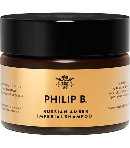 An anti-aging elixir of shampoo - rich honey texture. Suitable for all hair types, experience smoothness and radiant shine from the very first application. An intensive amino acid complex strengthens and rebuilds the hair. An exceptionally high dose of panthenol penetrates every strand of hair. Protection during color and keratin treatments. Application: Please pre-wash your hair with Philip B Peppermint Avocado Shampoo. Then first emulsify half a walnut-sized amount of shampoo with a few drops of water in your hands. Then apply to damp hair and scalp and massage through to the ends. Leave on for 3 to 5 minutes, then rinse thoroughly. Please follow with the Russian Amber Imperial Conditioner. ...