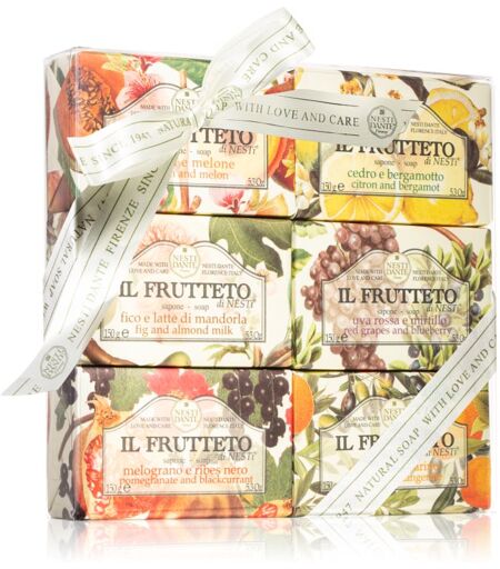 Nesti Dante Il Frutteto The Collection, 6x150 g, Cosmetic Sets for Women, Treat yourself or your loved ones to the perfect cosmetic set. The set contains: Red Grapes and Blueberry Natural Soap 150 g Olive Oil and Tangerine Natural Soap 150 g Citron and Bergamot Natural Soap 150 g Pomergranate and Blackcurrant Natural Soap 150 g Peach and Melon Natural Soap 150 g Fig and Almond Milk Natural Soap 150 g Characteristics: a set of cosmetic products for everyday use for thorough skin cleansing amazing as a gift How to use: Use every product from the cosmetic set according to the instructions. ...