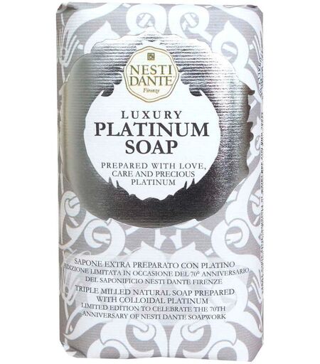 This luxurious 70th anniversary soap contains the most precious metal of all: platinum. It has been valued for its beneficial properties for centuries in traditional and Ayurvedic medicine. Platinum has an antioxidant effect, regulates perspiration and ensures healthy, firm and velvety soft skin. The soap is rounded off with an intense fragrance composition of typical Tuscan flowers such as Florentine Camellia and White Jasmine. Application: Thoroughly lather wet skin and rinse with clean water. For the production of Nesti Dante soaps, high-quality natural ingredients are used, such as olive oil, palm oil or coconut oil. Synthetic surfactants are deliberately avoided. The loving, handcrafted production and the high-quality ingredients result in an extremely high-quality, caring end product. Each bar of soap is provided with a long-lasting, fine fragrance, and each item is rounded off by the beautiful packaging. ...
