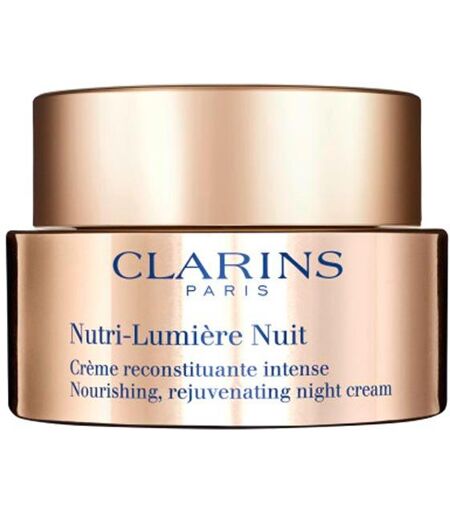 Innovation Pro-Ageing Nutrition Clarins. Laboratoires Clarins have developed a powerful duo of active ingredients that give new luminosity to the skin. Obtained from horse chestnut, biological flower extracts and eszine - active molecules from the fruit - are recognized for their action on the micronutrient network. This vital duo, born from the expertise of Laboratoires Clarins, optimizes the distribution of nutrients in the skin. It is better nourished and full of luminosity again. Blending beautifully with the skin, the enveloping comfort night cream Nutri-Lumière Nuit leaves the skin revitalized, nourished and radiant in the morning. revitalizesnourishesrevitalizes the skin's moistureApplication: Apply in the evening to the face and neck. ...