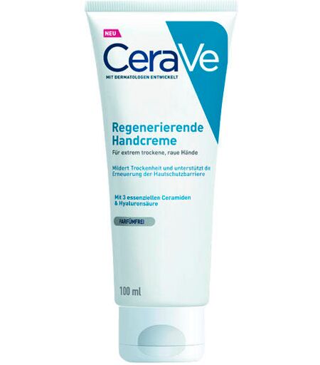 CeraVe Regenerating Hand Cream contains a combination of three essential ceramides 1, 3 and 6-II, which supports the particularly attacked and dry hands in building a healthy skin protective barrier. The active ingredients, such as ceramides and hyaluron, are released throughout the day through the patented active ingredient release system, restoring dry skin's sense of well-being. Application: Apply generously as often as desired. Suitable for adults and children. CeraVe: Developed with dermatologists In 2005, leading dermatologists from the USA researched a new, groundbreaking skin care product that would strengthen the skin's protective barrier in an innovative way. Their aspiration was to combine dermatological efficacy with maximum ease of use - for a silky, soft skin feel. This is how CeraVe was born. CeraVe Technology Multivesicular Emulsion Technology (MVE): a revolutionary care system that gradually releases valuable moisturizing ingredients, layer by layer, to provide the skin with long-term hydration. How CeraVe was created With the combination of ceramides and the patented active ingredient release MVE, CeraVe launched the three main products: Moisturizing Cream, Moisturizing Lotion and Moisturizing Cleansing Lotion. CeraVe today Currently, CeraVe offers a comprehensive range of face and body care products. CeraVe, that is high quality skin care for all. Developed with the expertise of dermatologists. ...