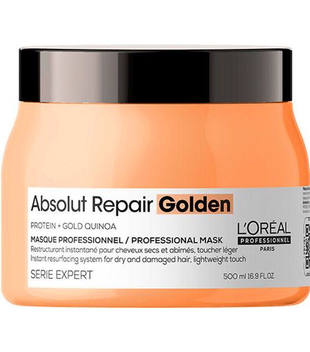 Absolut Repair Gold Mask from L'Oréal Professionnel Paris is specially designed for damaged and dry hair. Enriched with Golden Quinoa and protein, the professional form helps restructure and repair the hair through deep conditioning without weighing it down. Thanks to the golden texture, the mask gives stressed hair a beautiful shine. Hair becomes smoother, shinier and the hair surface is repaired. Application: Apply to washed, towel-dried hair and leave for 3 to 5 minutes, rinse thoroughly. ...
