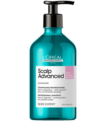 Scalp Advanced Anti-Discomfort Dermo-regulator Shampoo from L'Oréal Professionnel Paris is specially formulated to soothe sensitive scalps. Already after the first application, the hair becomes more soothed & +49% more hydrated*. *Instrumental test. Range of products to soothe sensitive scalps.Enriched with skin-soothing and skin-regulating active ingredientsDeveloped together with hairdressersTolerance tested by dermatologists Application: Apply evenly to wet scalp and hair. Gently lather with the softest part of the fingertip until a light foam is formed. Then rinse thoroughly. ...
