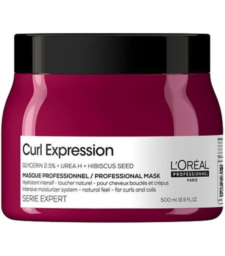Curl Expression Intensive Moisturizer Mask from L'Oréal Professionnel Paris is specially formulated for curly, wavy and frizzy hair. Enriched with glycerin, urea H and hibiscus seed extract, the formula provides intense moisture and detangles curls and frizzy hair for a flowing result. The hair immediately feels soft and smooth.*. *Instrumental test: cleansing gel shampoo + moisturizing mask. Directions: Massage evenly into washed towel-dried hair. Leave on for 10 minutes. Rinse thoroughly. Curl Expression Curls are naturally different. They require special care and styling products. Thanks to the highly effective active ingredients glycerin, urea H and hibiscus seed extract, Curl Expression provides definition and a frizz-free result, in addition to optimal hydration. ...