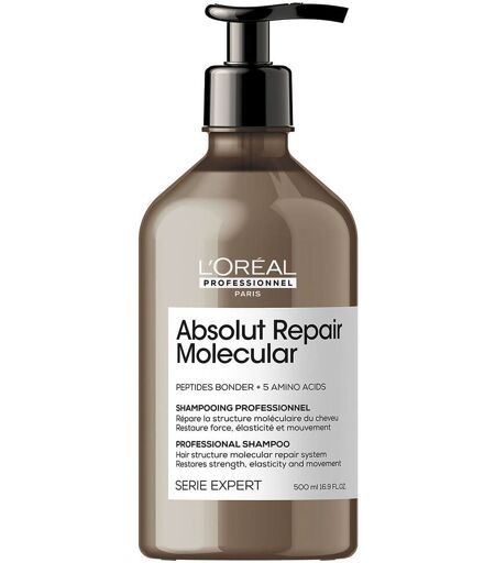 Absolut Repair Molecular Shampoo from L'Oréal Professionnel Paris is specially formulated for severely structurally damaged hair. Repairs 2 years of hair damage in just one application.*. Enriched with peptide bonding agents and 5 amino acids, it penetrates deep into the molecular hair structure and instantly transforms hair. The luxurious texture develops into a rich foam, cleanses and detangles the hair and provides intensive care. Strength, elasticity and mobility of the hair are restored. The result: strong, healthy-looking & flowing hair. Technology to repair the molecular structure of the hair.Enriched with 3% peptide bonding agents and amino acids.Rebuilds the molecular structure of the hair.**.Restores strength, elasticity and mobility of the hair.***.For severely structurally damaged hair. Directions: Apply evenly to wet hair. Lather until a rich foam is formed. Rinse. For best results, follow with Absolut Repair Molecular Rinse-Off Serum and Leave-In. *Instrumental test: macromolecular hair fiber structure after application of Absolut Repair Molecular Shampoo, Rinse-Off Serum and Leave-In. **Instrumental test: after 15 applications of Absolut Repair Molecular Rinse-Off Serum. ***Consumption test after 2 weeks of use of Absolut Repair Molecular Shampoo, Rinse-Off Serum and Leave-In. ...