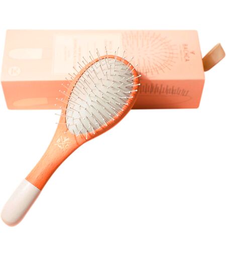 Thanks to their flexibility, the nylon pins detangle the hair effortlessly, even when it is wet. The nylon pins are perfect for sensitive or easily tangled hair, as they bend to prevent hair loss and split ends. The ball tips and rubber pad protect and gently massage the scalp. Suitable for all hair types. Very resistant beech wood handle. Application: You can use the brush on dry or wet hair to detangle it effortlessly. We recommend brushing your hair at least twice a day. To clean your Bachca brush, remove any hair stuck between the bristles, then use a small amount of mild shampoo, gently rub the brush and rinse thoroughly. Leave your brush to dry, bristles down, on a clean cloth for about a day. Do not use the brush under water and avoid prolonged contact with water. ...