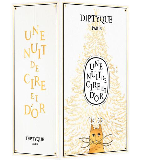 Once upon a time... "A night of wax and gold", a festive story by Diptyque. This year, Diptyque takes you into an enchanting story full of wonder and fantasy - in the heart of Saint-Germain-des-Prés, where the magic of the festive season comes to life. The trio of artists behind this creation reflects the three founders of Diptyque: contemporary poet Victor Pouchet created the winter story, illustrated with surrealism and humor by Parisian illustrator and bookseller Vincent Puente. Inès Mélia, a boldly imaginative artist, works with shapes and materials to bring a narrative dimension to poetic art objects that transform the narrative into tangible form. Set in a bookshop in Saint-Germain-des-Prés a few days before Christmas, the story follows the bookseller and his mischievous, highly educated cat Archibald. The pair discover a strange attraction in a small pine cone dipped in the shimmering wax of a scented candle. With each turn of the page, the alchemy of the holidays unfolds... This year, Diptyque's winter icons are reminiscent of a fairy tale, adorned with surreal designs and golden motifs. Their boxes and wrapping paper become the precious pages of history, imbued with poetry and light. A fairy tale that celebrates the magic of the holidays - with many loving details that playfully capture the magic of the festive season. Sapin (fir) candle - 70 gBaies (berries) candle - 70 gFeu de Bois (wood fire) candle - 35 gCandle Narguilé (water pipe) - 35 gCandle Ambre (Amber) - 35 gCandle Coing (quince) - 35 gCandle Santal (sandalwood) - 35 gOdour-neutralizing candle with basil - 35 gRoses candle - 35 gOrphéon cream perfume (refillable) - 3 gOdour-neutralizing room spray with basil - 10 mlLilyphéa Eau de Parfum - 10 mlLunamaris Eau de Parfum - 10 mlFleur de Peau Eau de Parfum - 7.5 mlOrphéon Eau de Parfum - 7.5 mlDo Son Eau de Parfum - 7.5 mlEau Rose Eau de Parfum - 7.5 mlFleur de Peau Hair Perfume- 30 mlPhilosykos Perfumed Body Lotion - 50 mlDo Son Perfumed Hand Cream - 45 gDo Son Perfumed Soap - 25 gSatin body oil - for body and hair - 50 mlGentle washing lotion - for the hands - 30 mlWash lotion with exfoliating effect - for hands - 30 mlDecoration set (x2) ...