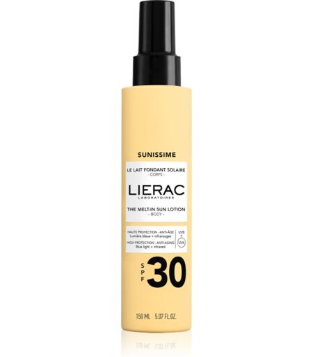 Lierac Sunissime The Melt-in Sun Lotion SPF 30, 150 ml, Pre-tanning Products for Women, Protect your skin from sunburn, premature aging and other damage caused by sunshine. Lierac Sunissime The Melt-in Sun Lotion SPF 30 is a sunscreen that provides an effective protective shield against UV rays and helps you prevent not just sunburn and pigment spots, but also reduced skin elasticity, collagen loss and other signs of ageing. Last but not least, it significantly reduces the risk of getting skin cancer. Characteristics: protects skin against UVA and UVB radiation easy to spread without leaving an oily film extends your tanned look prevents skin ageing How to use: Apply plenty of the product to the skin all over the body before going out in the sun. ...