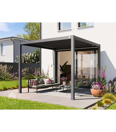 3x3m Pergola, louvered roof, pearl grey: High-quality, elegant, and built for year-round use, the premium pergola features a roof with adjustable steel slats that can be opened up to approximately 105 degrees using a smooth crank mechanism. The durable combination of aluminium and steel, along with robust 100mm thick aluminium square profiles, ensures exceptional stability. Both the posts and beams are fully resistant to corrosion and weathering, offering long-lasting performance. Available in three sizes—3x3m, 3x4m, and 3x6m—the pergola comes in a choice of stylish finishes: a pearl grey frame with a matching slatted roof, a white frame with a white roof, or a wood-effect frame with a pearl grey roof. ...