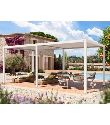 3x6m Pergola, louvered roof, white: High-quality, elegant, and built for year-round use, the premium pergola features a roof with adjustable steel slats that can be opened up to approximately 105 degrees using a smooth crank mechanism. The durable combination of aluminium and steel, along with robust 100mm thick aluminium square profiles, ensures exceptional stability. Both the posts and beams are fully resistant to corrosion and weathering, offering long-lasting performance. Available in three sizes—3x3m, 3x4m, and 3x6m—the pergola comes in a choice of stylish finishes: a pearl grey frame with a matching slatted roof, a white frame with a white roof, or a wood-effect frame with a pearl grey roof. ...