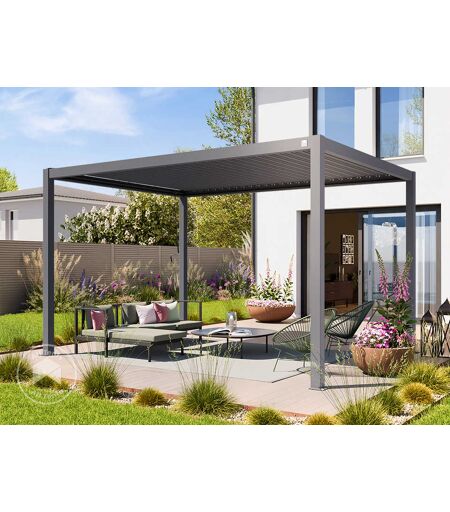 3x4m Pergola, louvered roof, pearl grey: High-quality, elegant, and built for year-round use, the premium pergola features a roof with adjustable steel slats that can be opened up to approximately 105 degrees using a smooth crank mechanism. The durable combination of aluminium and steel, along with robust 100mm thick aluminium square profiles, ensures exceptional stability. Both the posts and beams are fully resistant to corrosion and weathering, offering long-lasting performance. Available in three sizes—3x3m, 3x4m, and 3x6m—the pergola comes in a choice of stylish finishes: a pearl grey frame with a matching slatted roof, a white frame with a white roof, or a wood-effect frame with a pearl grey roof. ...