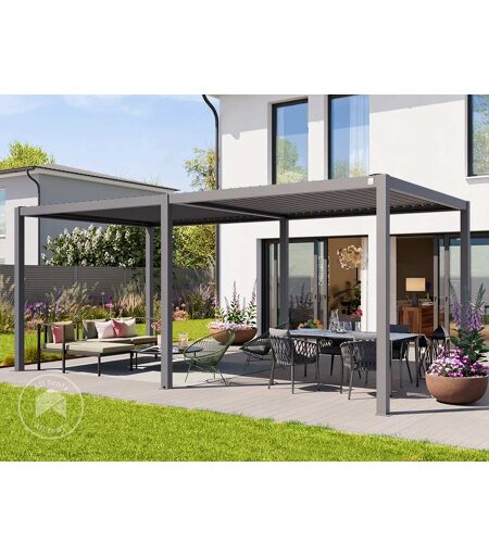 3x6m Pergola, louvered roof, pearl grey: High-quality, elegant, and built for year-round use, the premium pergola features a roof with adjustable steel slats that can be opened up to approximately 105 degrees using a smooth crank mechanism. The durable combination of aluminium and steel, along with robust 100mm thick aluminium square profiles, ensures exceptional stability. Both the posts and beams are fully resistant to corrosion and weathering, offering long-lasting performance. Available in three sizes—3x3m, 3x4m, and 3x6m—the pergola comes in a choice of stylish finishes: a pearl grey frame with a matching slatted roof, a white frame with a white roof, or a wood-effect frame with a pearl grey roof. ...