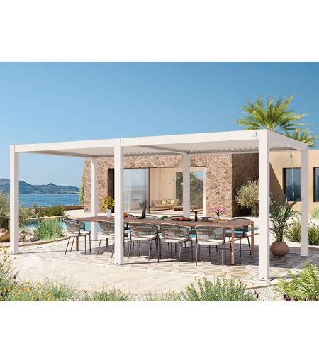 3x6m Pergola, louvered roof, white: Minimalist, rust-resistant, and built for year-round use—the deluxe pergola is the perfect blend of style and functionality. Featuring a practical aluminium roof with adjustable slats, it allows you to control sunlight and ventilation with ease. The smooth crank mechanism enables effortless adjustment, opening the slats up to approximately 135 degrees. Thanks to their hollow chamber profile, these slats offer exceptional stability and a high snow load capacity. Available in three sizes—3x3m, 3x4m, and 3x6m—the pergola comes in a choice of stylish finishes: a wood-effect frame with a pearl grey slatted roof, a pearl grey frame with a matching roof, or a sleek white frame with a white roof. Whether freestanding or positioned against a building, this pergola combines elegance with durability. Additional benefits include an integrated water drainage system, full resistance to corrosion and weathering, and a high degree of pre-assembly for quick and easy installation. ...